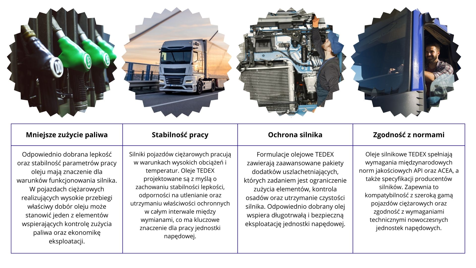 Formulacje olejowe TEDEX projektowane są z myślą o rzeczywistych warunkach eksploatacyjnych, z jakimi spotykają się silniki pojazdów ciężarowych, zarówno w transporcie długodystansowym, jak i w pracy lokalnej. Dobór odpowiedniej lepkości oraz klasy jakościowej stanowi fundament bezpiecznej i ekonomicznej eksploatacji.