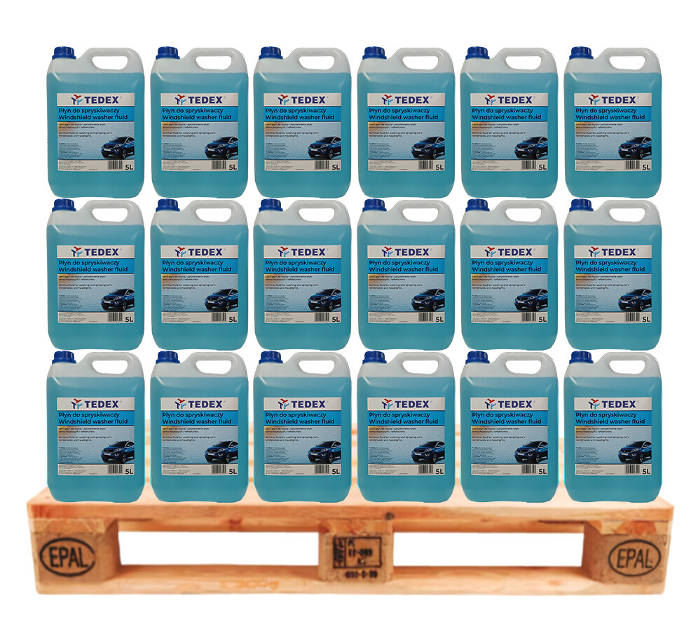 Paleta 5L x 80 szt. płynu do mycia i spryskiwania szyb samochodowych oraz reflektorów w sezonie letnim. Płyn powstał na bazie glikolu etylenowego oraz alkoholu izopropylowego z dodatkiem środków powierzchniowo czynnych i kompozycji zapachowych.